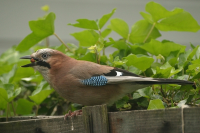 Zat op het tuinhekje. Had net een pinda uit het netje verorberd. Door het raam van de tuindeur geschoten. Scientific name: Garrulus glandarius