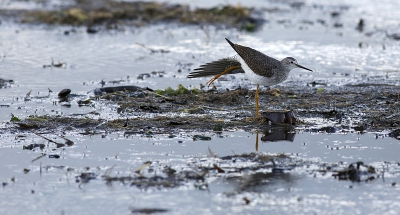 Tussen het foerageren even het pootje strekken. Scientific name: Tringa flavipes