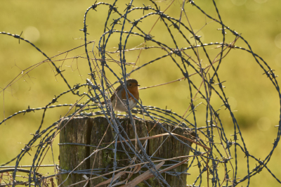 sluierbewolking, tegenlicht. Vanuit de auto gemaakt op ca 5 meter afstand. in de omgeving zijn meerdere roofvogel;s (o.a. buizerd) actief. De "kooi" van prikkeldraad geeft een uitstekende bescherming. Scientific name: Erithacus rubecula