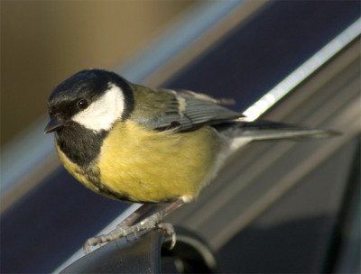 Deze koolmees vloog me tegemoet toen ik bij het bezoekerscentrum van Staatsbosbeheer aan de Knardijk uit de auto stapte.  Wilde absoluut op de foto gezet worden en koos daarvoor mijn autospiegel uit! Waarschijnlijk dezelfde koolmees als recent gefotografeerd door Leslie van Loo.