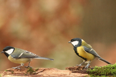twee verschillende kleuren koolmezen op een stok. Scientific name: Parus major