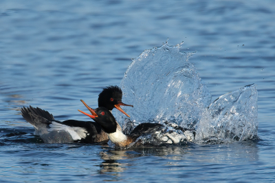 Op een prachtig zonnige dag waren de zaagbekken flink aan het stoeien om de vrouwtjes te imponeren. Dat vonden ze kennelijk belangrijker dan afstand houden, want ze kwamen behoorlijk dichtbij.. Scientific name: Mergus serrator