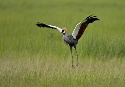 In Tanzania bezochten we oa Katavi, een zeer afgelegen park. Het was regentijd en behoorlijk groen. Op de laatste middag stuiten we op 2 Grijze Kroonkraanvogels. Eén sprong plots op. Waarschijnlijk een gevaar op de grond (slang?), aldus onze gids. Scientific name: Balearica regulorum