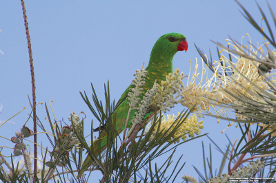This mainly green Lorikeet feeds on the nectar and pollen on native plants such as eucalypts, melaleucas and the grevillea pictured.  Often with Rainbow Lorikeets. Scientific name: Trichoglossus chlorolepidotus