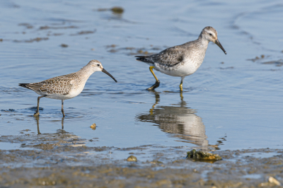 De krombekstrandloper was een nieuwe soort voor me de afgelopen vakantie op Texel. Op deze foto gezamenlijk met een kanoet aan het foerageren. Scientific name: Calidris ferruginea
