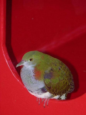 Deze duif is op ons schip aan komen vliegen toen wij ons ergens tussen Nieuw Guinea en De Filipijnen bevonden. Ik vermoed dat de vogel wilde uitrusten. Scientific name: Ptilinopus superbus