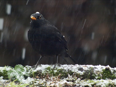 deze merel bezoekt regelmatig de voedertafel. Hier tijdens een zware sneeuwbui op zondagmiddag 10 december Scientific name: Turdus merula