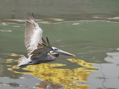 Op een mistige dag op de Monterey Bay wilden de walvissen niet bepaald meewerken maar waren de pelikanen weer in grote getalen aanwezig. Deze gleed vlak langs de boot....een mooie kans. Scientific name: Pelecanus occidentalis