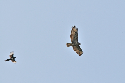 Deze Ekster zat acher de Buizerd aan boven het paardewed in Amersfoort. ik heb deze foto vanuit mijn slaapkamer raam kunnen maken helaas wel tegen de zon in. maar daardoor schijnt het licht wel mooi door de vleugls heen. Het feit dat dit alles boven de stad af speeld waar je anders nooit een roofvogel tegen komt maakt dit, denk ik tot een byzondere foto die plaatsing verdient. Scientific name: Buteo buteo