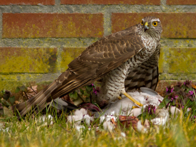 Papa... er is een duif gewond! Mijn zoontje van 6 holde me tegemoet. Het is al een echte vogelaar aan het worden. Het volgende tafereel tref ik aan verderop bij ons in de straat. Een stoere vrouwtjessperwer die z'n net geslagen prooi (duif) goed afschermt en ons doordringend aankijkt. Hard, maar dit wilde ik graag nog eens meemaken! De duif was niet meer te redden..;) Scientific name: Accipiter nisus