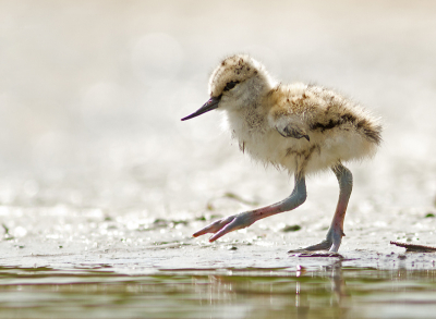 Zo leuk..! We zagen ineens een kluut in een gekke houding op z'n hurken zitten. We keken nog eens goed en er staken 6 poten onderuit. Toen dat ineens begon te wandelen, kwam dit eruit. Vind het tegenlicht hier van meerwaarde door het lichtrandje rond het klutenjong. Let ook eens op de kleur poten!