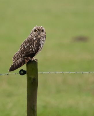 Hier nog een foto van mijn eerste ontmoeting met dit prachtige beest! In dit geval zou de regel echter zijn: more mm is better :wink: Ik had namelijk in totaal 450mm  (300x1,5), en hij zat op 20meter afstand. Voor een niet voorbereide ontmoeting met een velduil, is dat nog best dichtbij volgens mij.  Bij mijn vorige velduil foto, zag ik dat de compositie, en de uitsnede niet bepaalt in de smaak viel.  Ik heb een stuk van de onderkant van de paal weggehaald. De vogel heb ik aan beide kanten meer ruimte gegeven.