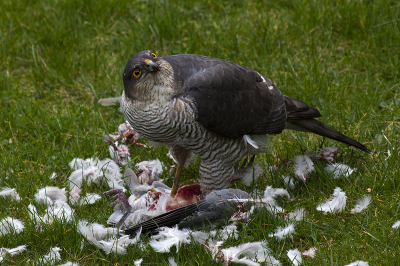 Deze sperwervrouw was geconcentreerd bezig aan haar middageten. (Duif) Prachtig hoe ze mij hier met een schuine kop in de gaten houdt. Scientific name: Accipiter nisus