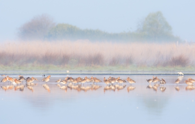 De laatste van de mistochtend vorige zondag: nu is de mist bijna opgelost maar ligt nog wel een dunne witte waas over het landschap. Gekozen voor een klassiek symmetrische uitsnede. Scientific name: Limosa limosa